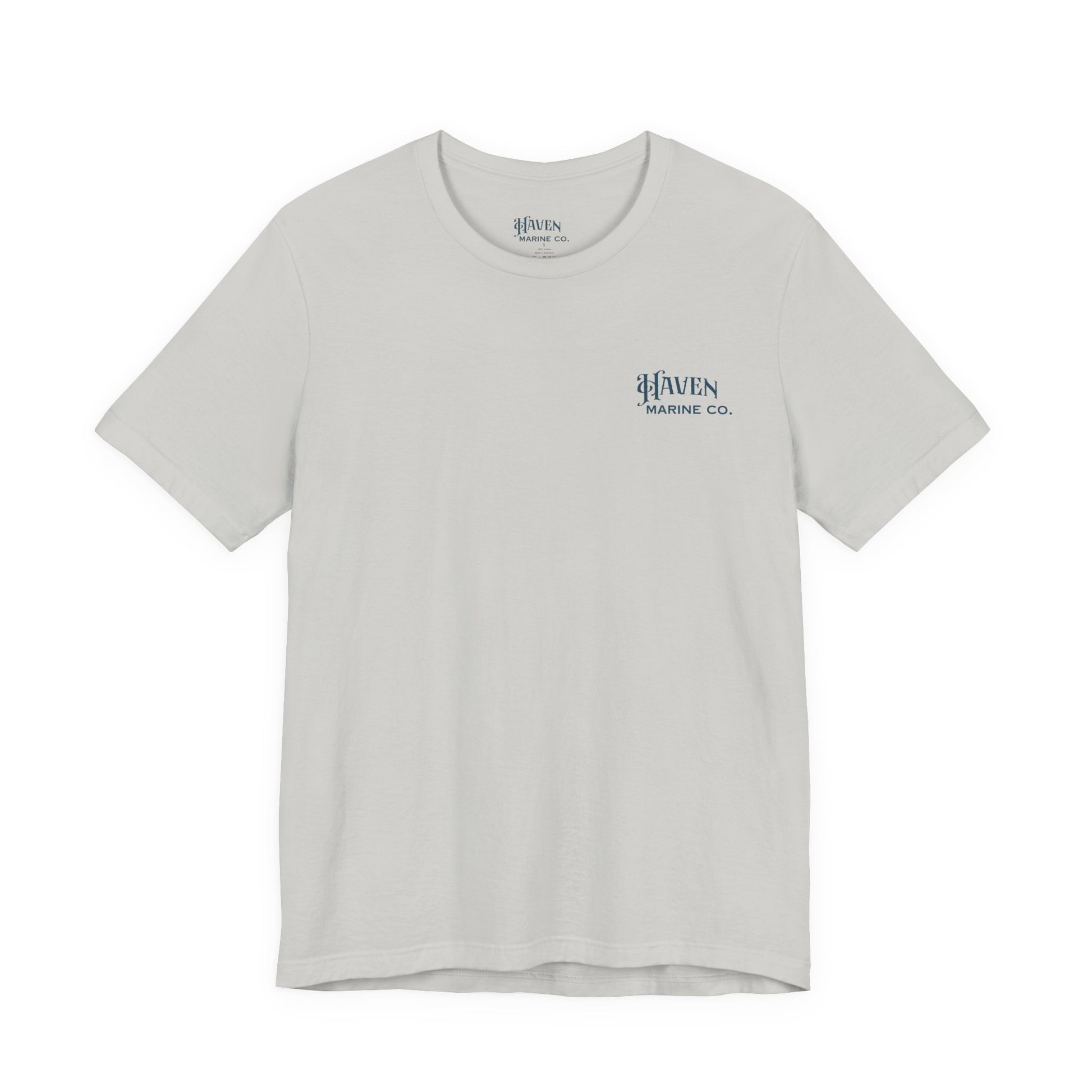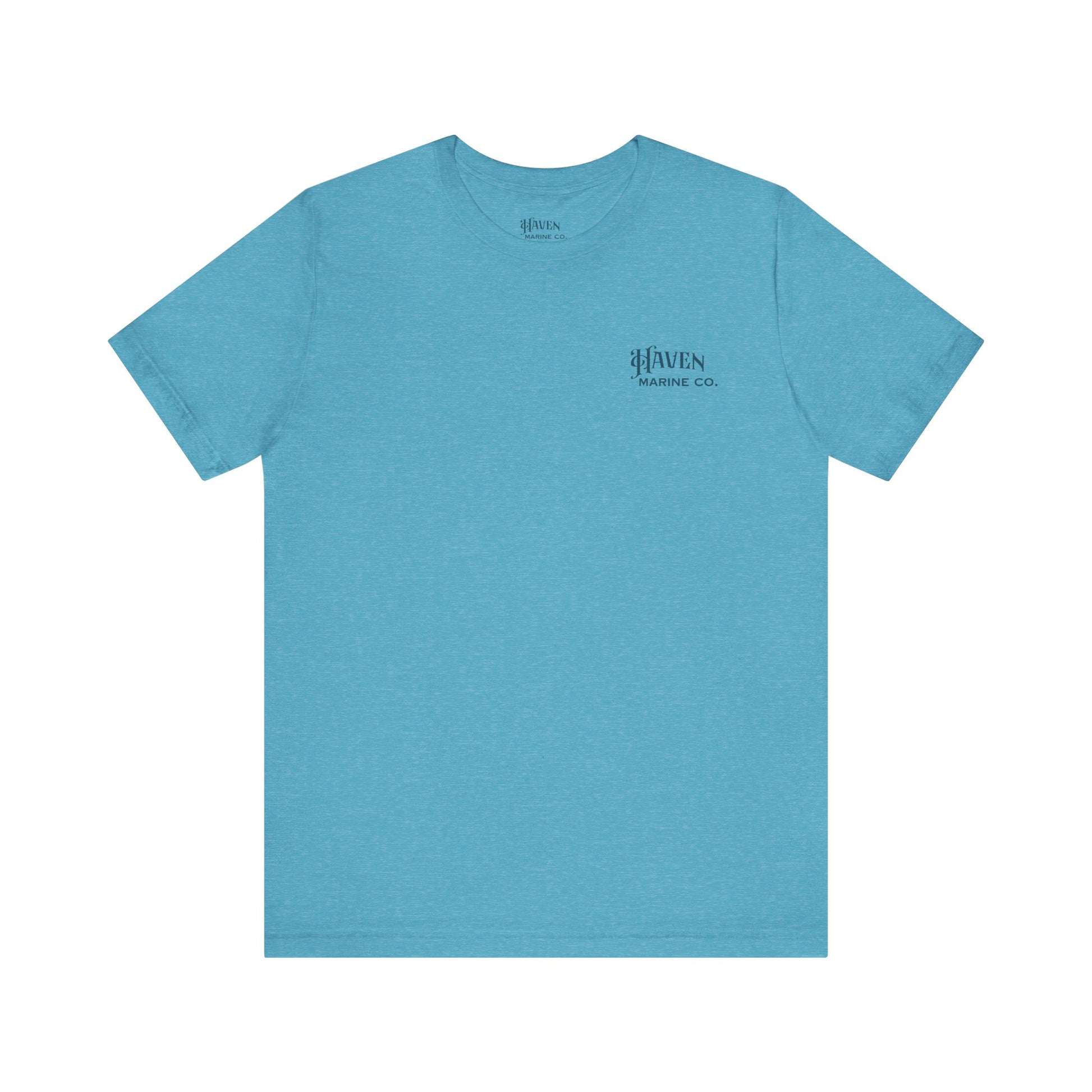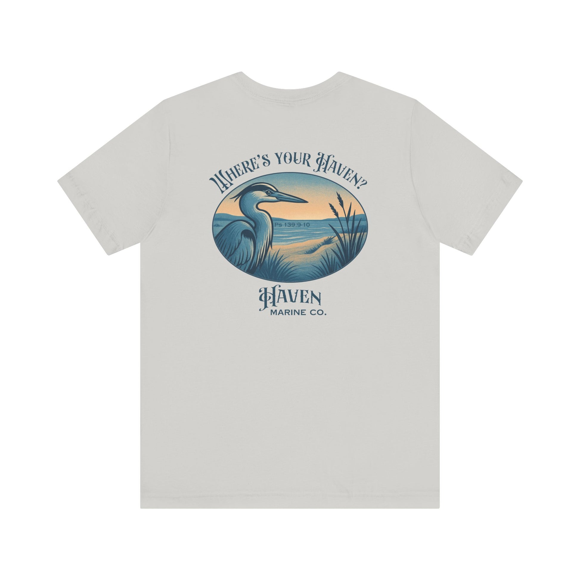 Where's Your Haven? Our haven is the place we can go to experience God in nature which is almost always on the water in some way. Sometimes we find Him in the peace and serenity of a paddleboard on glassy smooth water or with only the whisper of waves, and sometimes we feel closest to Jesus in the power and majesty of his creation while miles offshore fighting trophy fish. This shirt is about the stillness, wisdom, and calm strength a blue heron represents, and that's why the passage of Scripture is Psalm 139:9-10 "If I rise on the wings of the dawn, if I settle on the far side of the sea, even there your hand will guide me, your right hand will hold me fast."