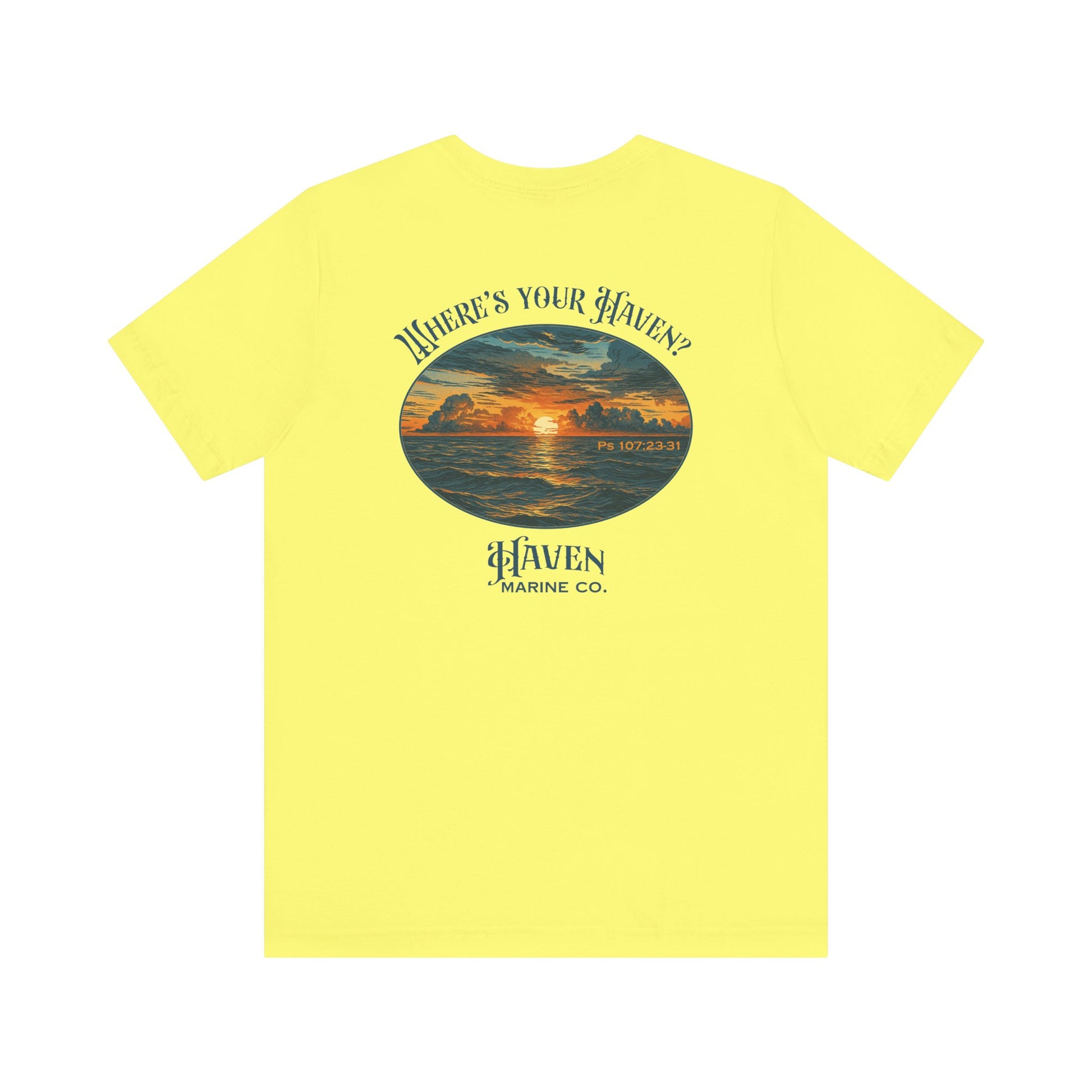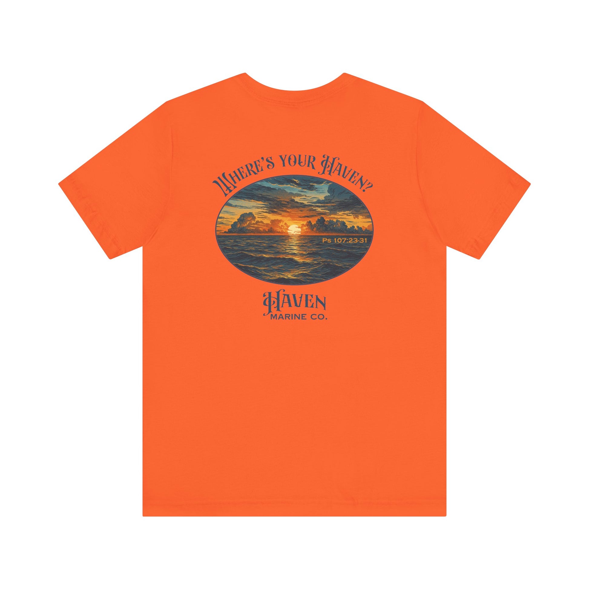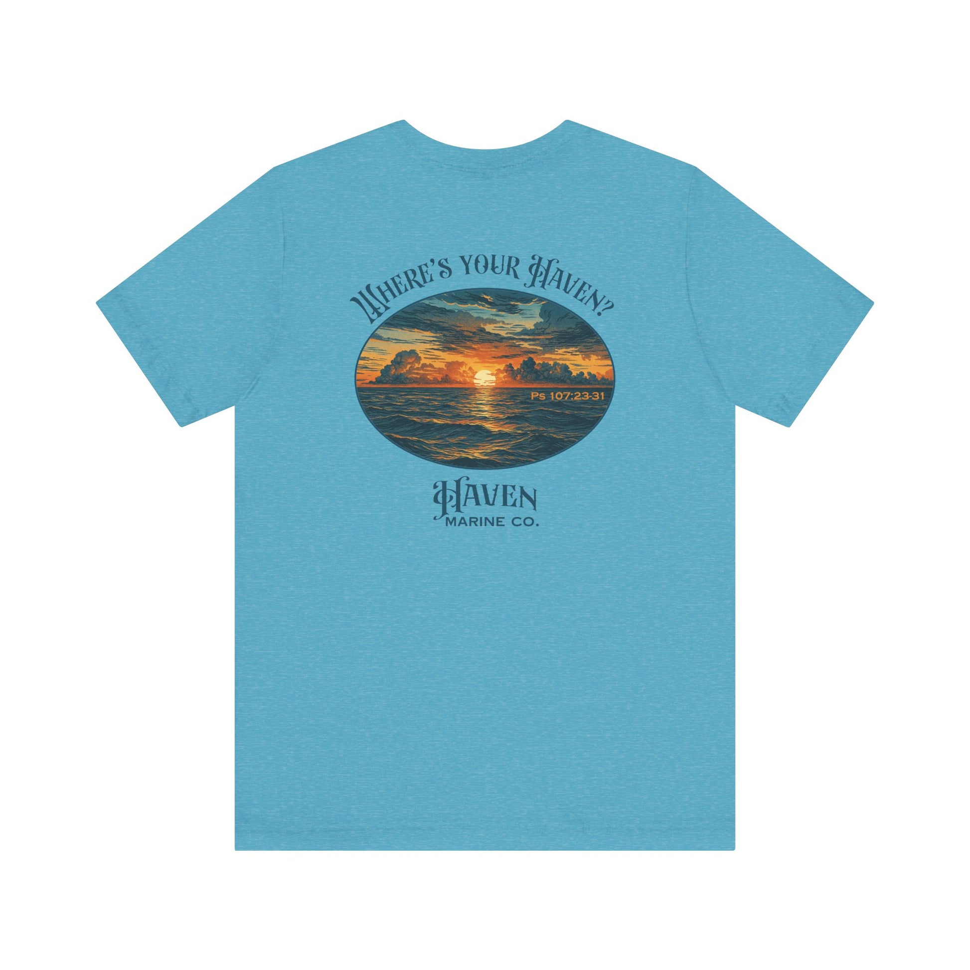 Where's Your Haven? Our haven is the place we can go to experience God in nature which is almost always on the water in some way. Sometimes we find Him in the peace and serenity of a paddleboard on glassy smooth water or with only the whisper of waves, and sometimes we feel closest to Jesus in the power and majesty of his creation watching the sun crest the horizon either the mirror of glassy smooth water or the power of the waves. This shirt is about the latter, and that's why the scripture is Psalm 107:23-31.