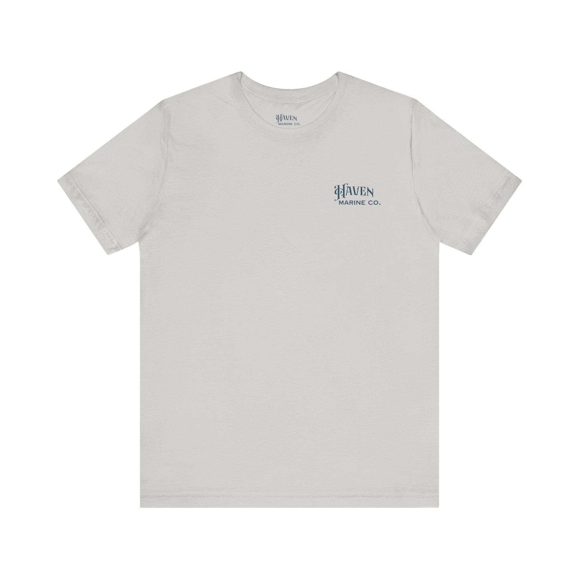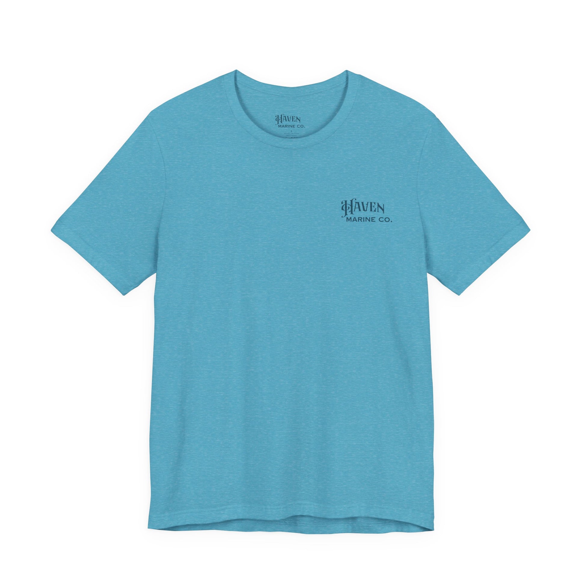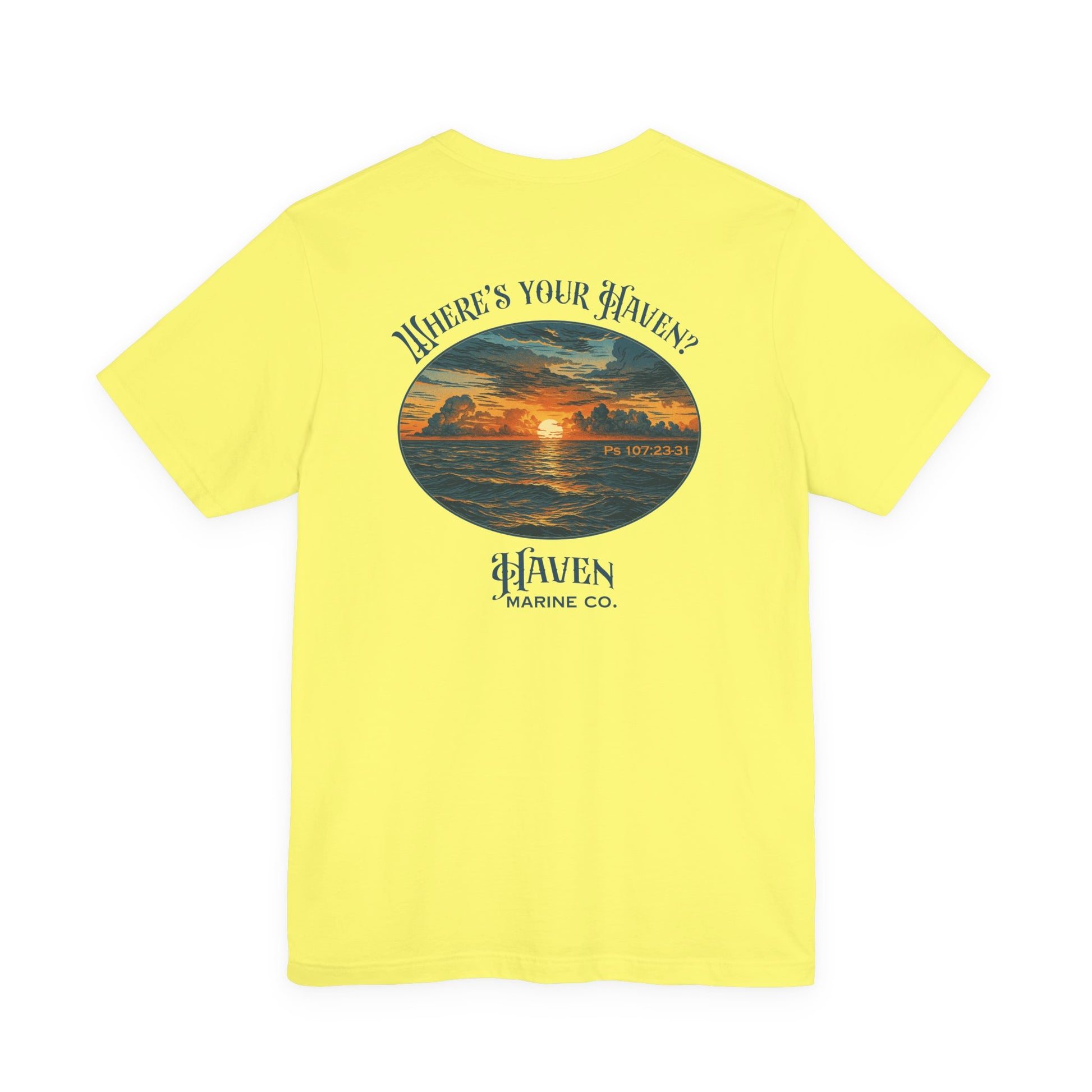 Where's Your Haven? Our haven is the place we can go to experience God in nature which is almost always on the water in some way. Sometimes we find Him in the peace and serenity of a paddleboard on glassy smooth water or with only the whisper of waves, and sometimes we feel closest to Jesus in the power and majesty of his creation watching the sun crest the horizon either the mirror of glassy smooth water or the power of the waves. This shirt is about the latter, and that's why the scripture is Psalm 107:23-31.